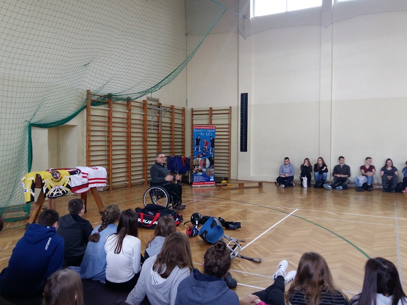 Zawodnik opowiadał o zasadach gry hokeju na sledgach , a także o swojej paraolimpijskiej karierze. Zaprezentował krótkie filmiki, którymi przybliżył uczniom atmosferę paraolimpiad i pokazał sprawność fizyczną osób niepełnosprawnych. Na zakończenie uczniowie mogli obejrzeć stroje reprezentacyjne i złoty medal sportowca oraz zrobić pamiątkowe zdjęcia.