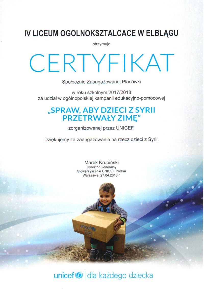 W roku szkolnym 2017/2018 uczestniczyliśmy w ogólnopolskiej kampanii edukacyjno-pomocowej: „Spraw, aby dzieci z Syrii przetrwały zimę". Celem projektu było uwrażliwienie na problemy i potrzeby dzieci w kraju, w którym trwa wojna.