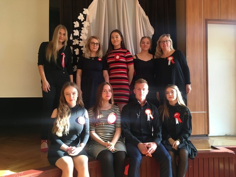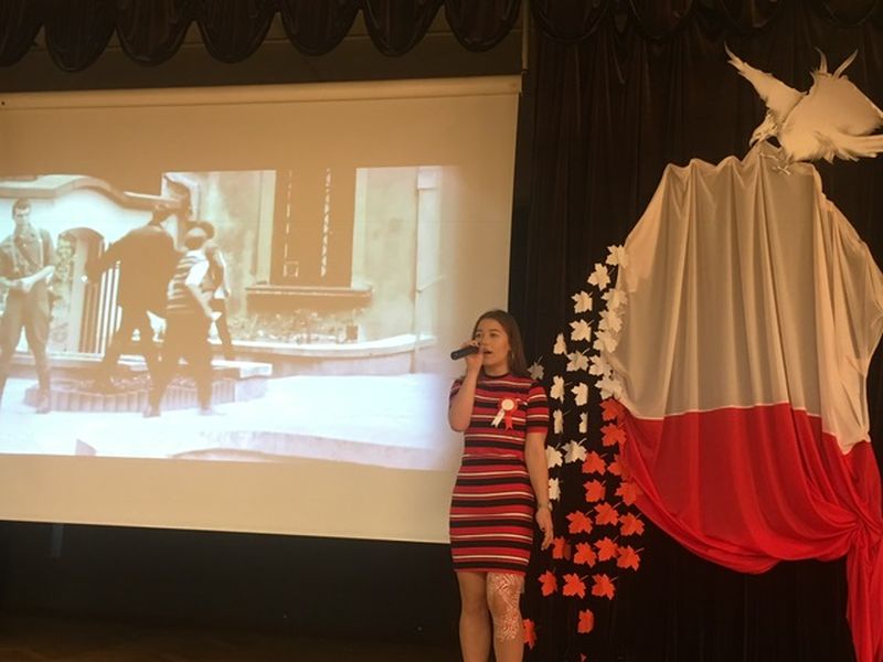 Punktem kulminacyjnym była uroczysta akademia przygotowana przez panią Małgorzatę Mularską. Profesjonalnie i wzruszająco wykonane utwory zawdzięczamy utalentowanym uczniom z naszej szkoły: Nadii Kameckiej z klasy 1a, Nikoli Wiatr z klasy 1c , Zosi Lebiodzie z klasy 2c, Alicji Halarczyk z klasy 2a i Kamilowi Bielowi z klasy 2b. Uroczystość prowadziły : Klaudia Bronhard i Natalia Siedlecka z klasy 2a. Oprawę muzyczną przygotowała i pięknie na gitarze grała pani Małgorzata Urban. Całość montażu multimedialnego i dźwięk zawdzięczamy staraniom Aleksandry Gronuś z klasy 3a. Wszystkim młodym artystom podziękowano gromkimi brawami. Niezapomniane, wzruszające chwile zostaną na długo w naszej pamięci.