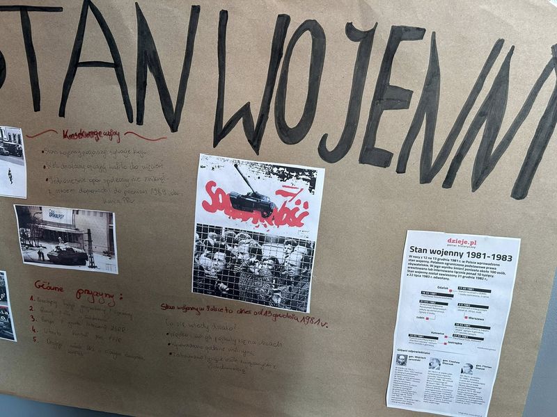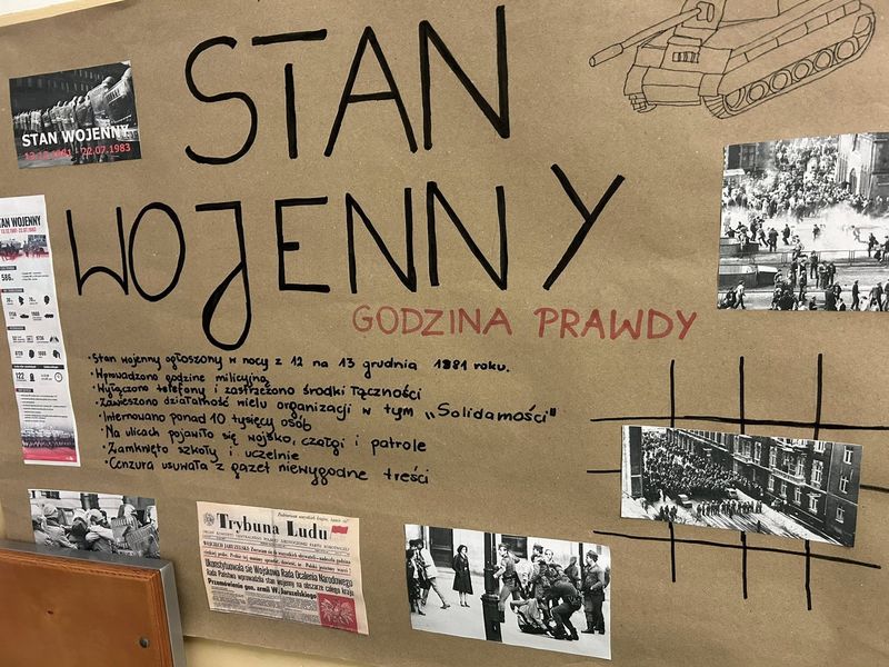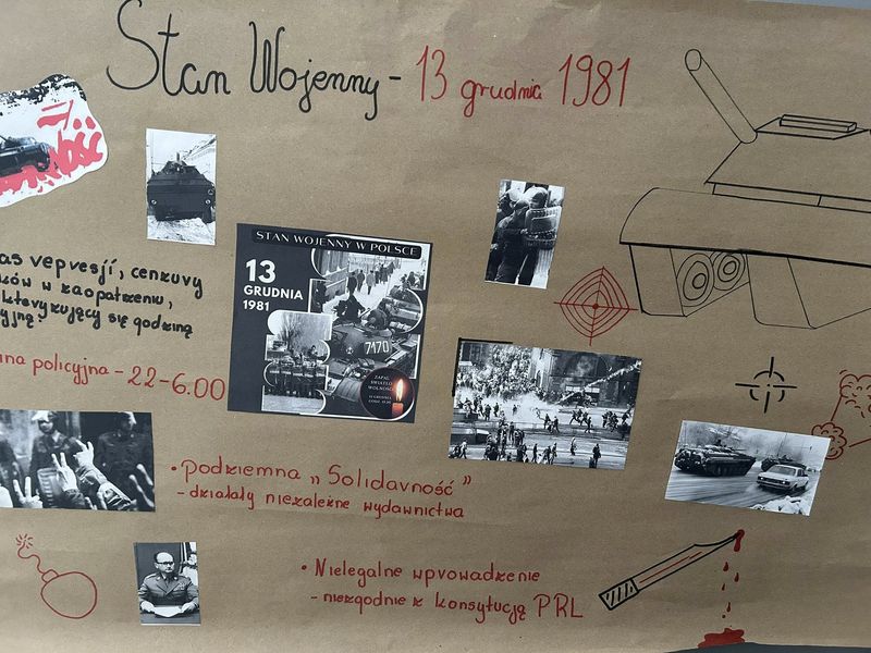 W naszej szkole przeprowadziliśmy kampanię edukacyjną poświęconą wydarzeniom 13 grudnia 1981 r. – jednemu z najbardziej dramatycznych momentów w powojennej historii Polski. To czas, który dotknął milionów ludzi: ograniczono wolność, wprowadzono godzinę milicyjną, internowano działaczy „Solidarności", a w wielu domach zapanował strach i niepewność.